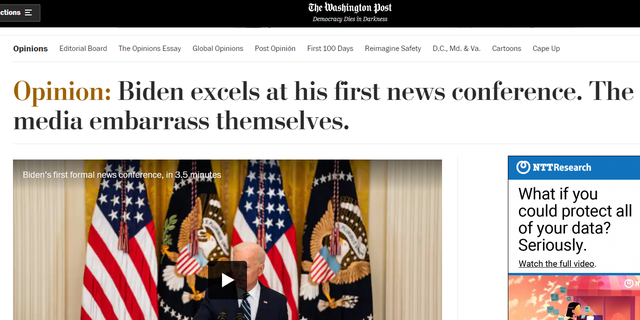 “After weeks of whining, the White House press corps got its first official Biden presidential news conference on Thursday,” Rubin began her column, titled “Biden excels at his first news conference. The media embarrass themselves.”