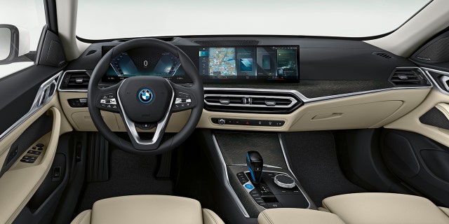 The four-door hatchback is slightly larger than the BMW 3-Series and doesn’t stray too far from its styling, including its oversized “kidney” grille, which is mostly closed off since electric cars don’t need as much cooling as ones powered by internal combustion engines do.